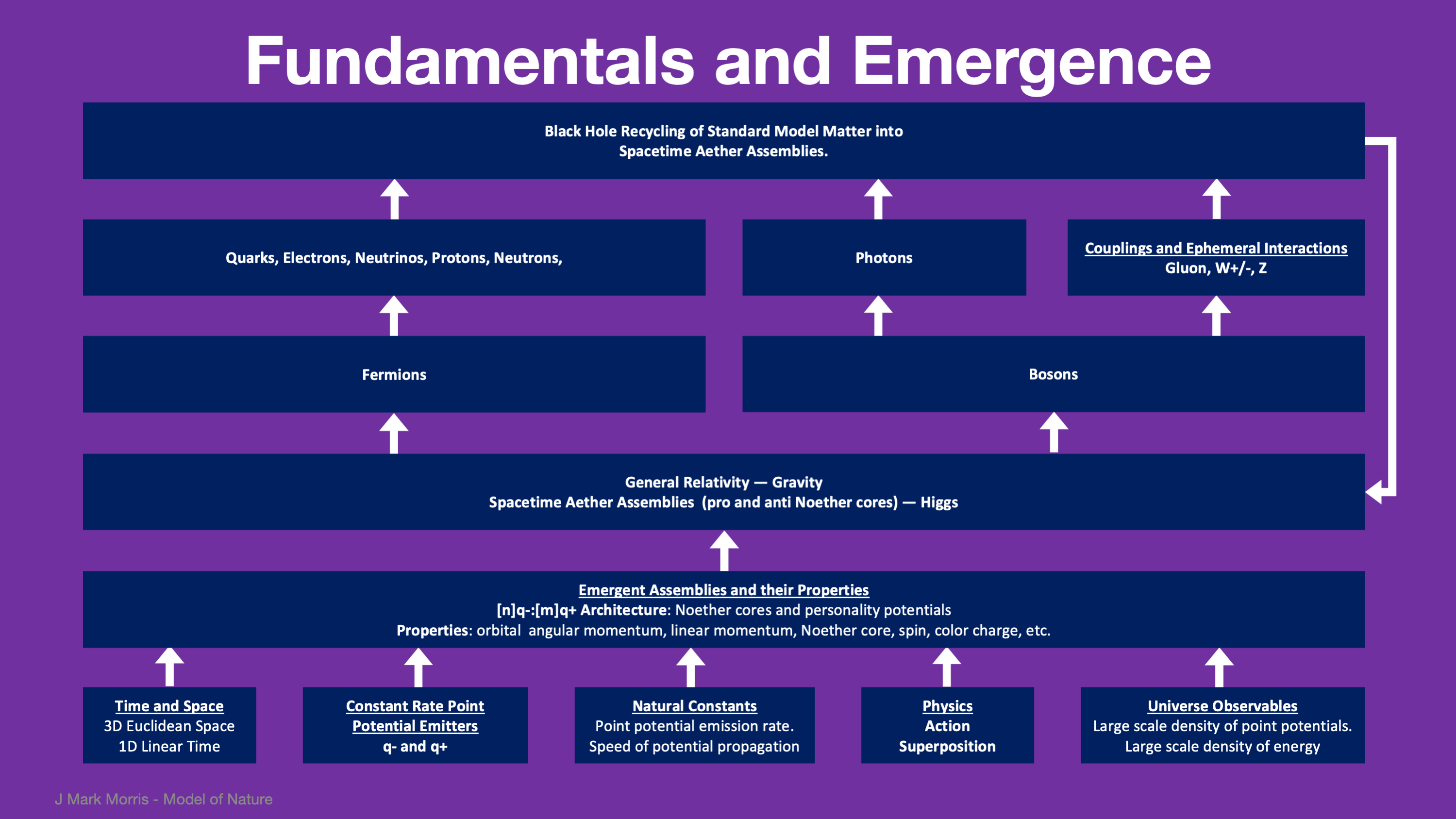 This chart shows the basic ingredients of the universe on the bottom row, and how those lead to emergent assemblies. Above that is the grand loop. Spacetime is formed from triply nested point potential binaries at different scales (frequency, velocity, orbital radius). The recycling is fed by extremely high energy Noether cores escaping out of a black hole (of sufficient conditions). From there we go through the big bang timeline, forming standard model particles, but according to a new point potential assembly architecture. Superposition leads to a shielding of energy and spacetime assemblies are almost totally cloaked. Reactions happen and we observe quarks, electrons, neutrinos, photons, W+/- and Z bosons, and the Higgs spacetime aether assemblies often are input reactants or products to a standard model transmutation reaction.