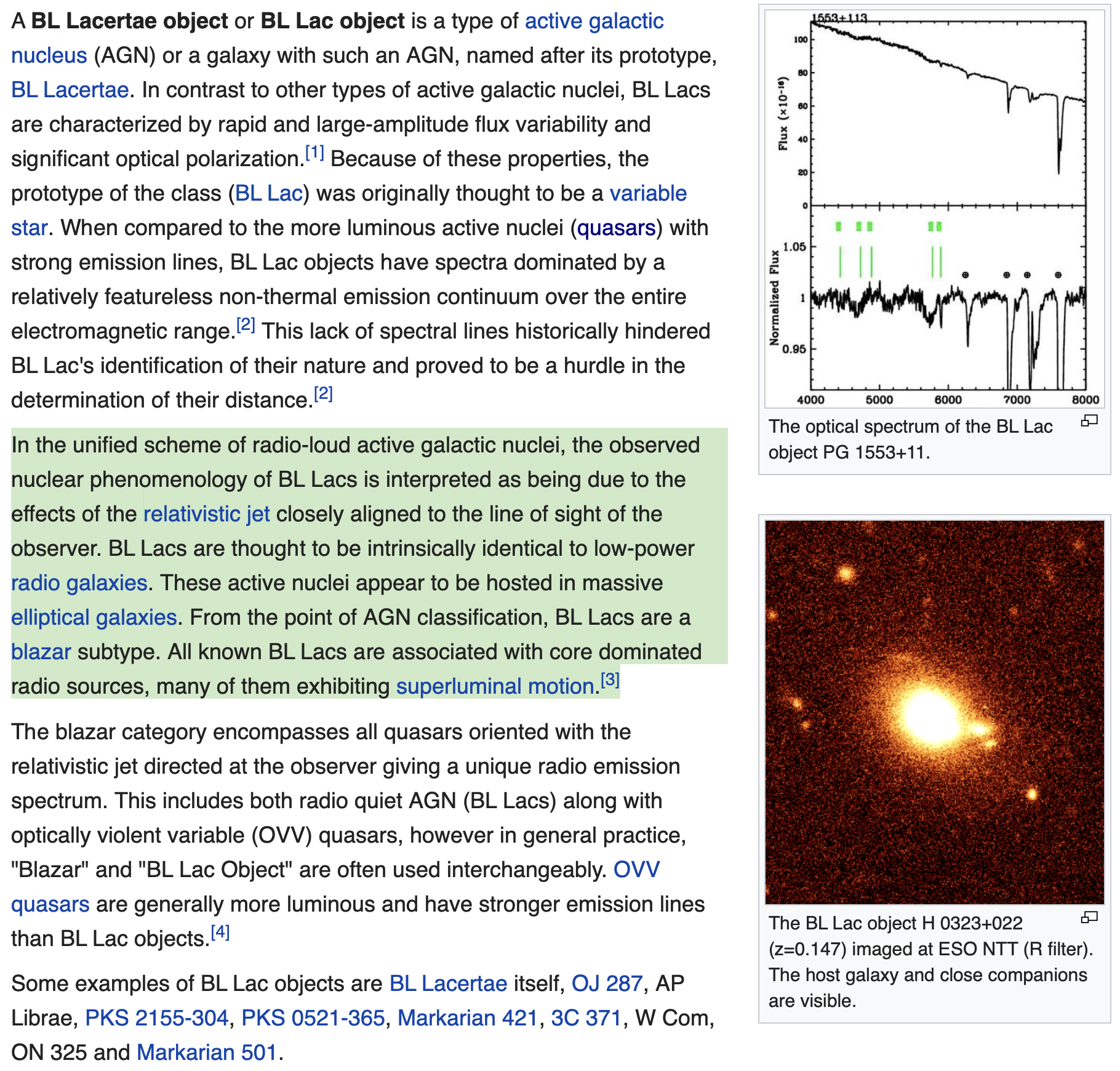 Wikipedia provides our first result. Could BL-LACs be the Planck plasma jet terminii? No more bending over backwards to model BL-LACs as being aimed towards the observer to explain the superluminality. Nope. The Planck plasma jet may truly be superluminal. General relativity does not apply to point charge plasma jets as they pierce through the æther.