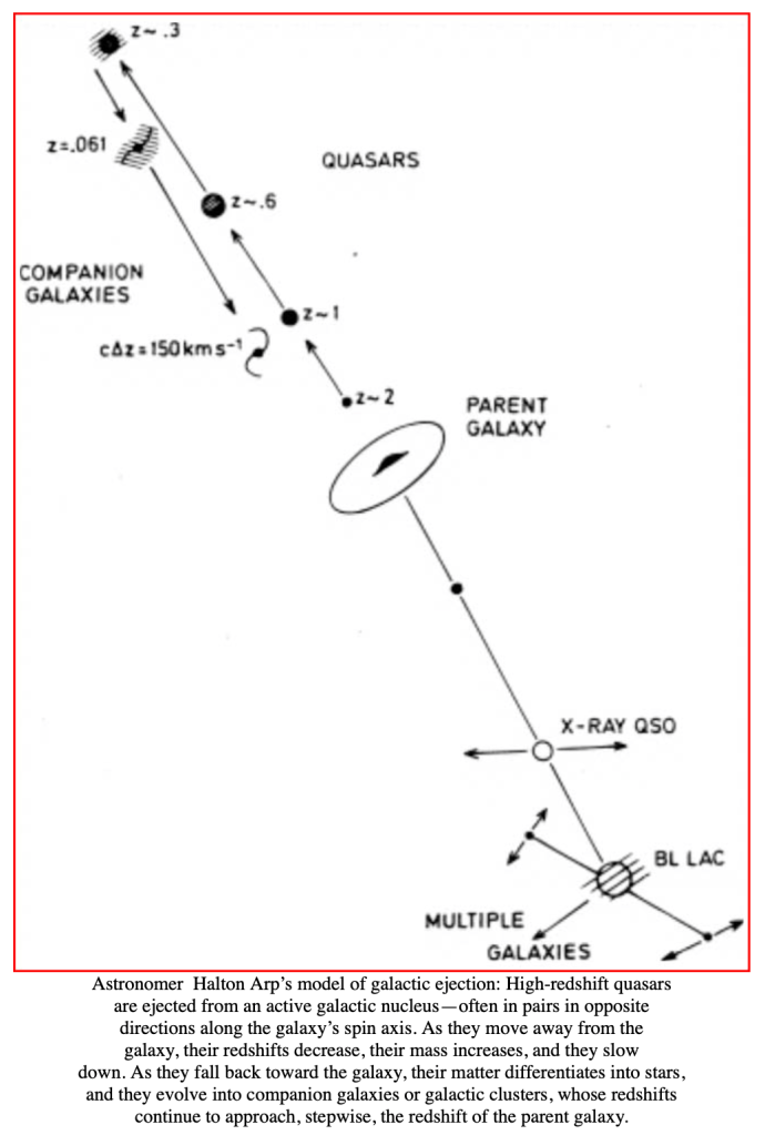 - Halton Arp’s observations of this parent-child galaxy relationship was very insightful, and it deserves to be fully recognized as we re-evaluate our understanding of redshift given the natural occurence of galaxy local inflation. (see figure below)