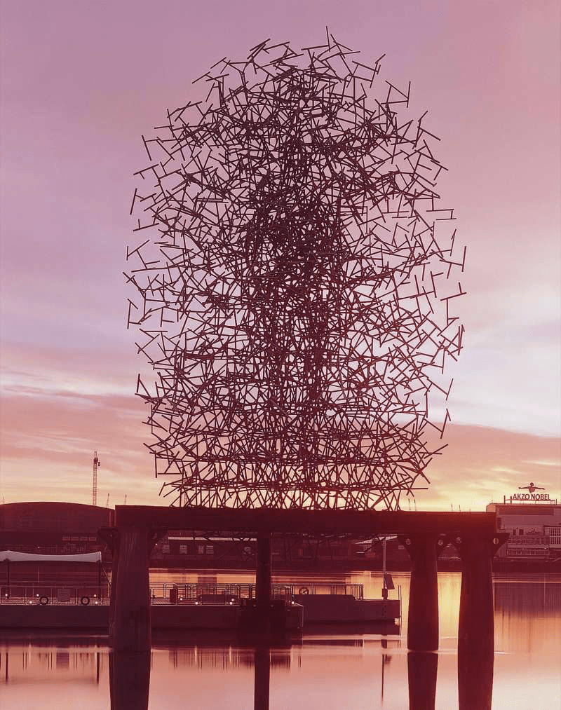 Antony Gormley : “We aren’t just things in space. We are places of transformation. And furthermore our relationship with others but with all phenomena is very much a question of our relative positions. I think that was something else that really deeply affected me about Bohm’s work — the participant nature of the observer in the the emerging of what we call reality. The way that Quantum Cloud works is that you are the determiner of what you see. This is a mess of elements that are both particles and hopefully trajectories that come together and depending on where your position is either in a boat or walking along the side of the Thames and depending on the time of day you will see or not see the possibility of a body. Quantum physics invites us to be participaters in that emerging of a world and it has very very fundamental I think both philosophical, spiritual, and political implications which are essentially that each of us is a co-producer of a world — that each of us is a co-producer of a possible future. The work of people like Einstein, Bohm they are like huge windows opening in the imagination to a way of dealing with life and the things we encounter within it freshly and in a sense with the right level of uncertainty.”