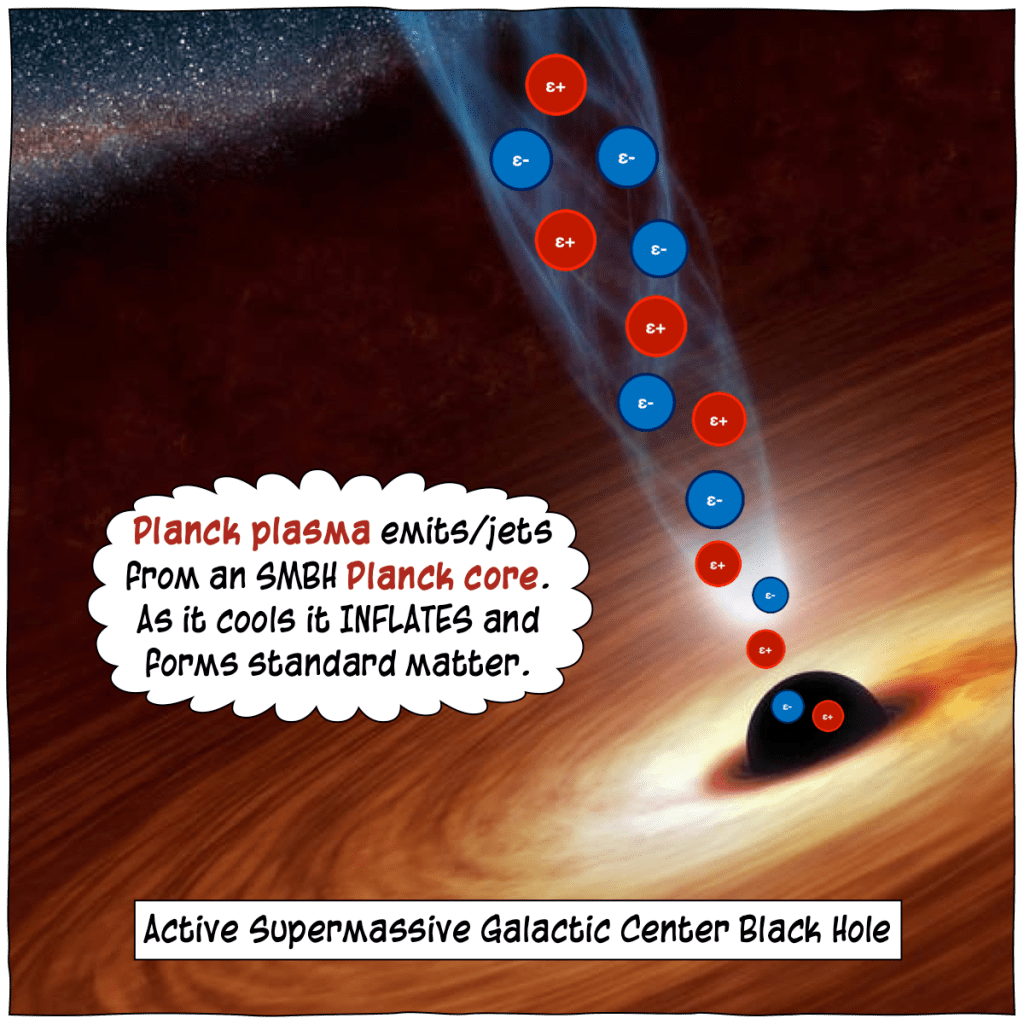 | Big Bang / Inflation does not explain precursor of particles that emerge. | NPQG teaches that electrinos and positrinos are conserved and that they are supplied to the mini-bang / inflation event from the Planck core of an SMBH. |