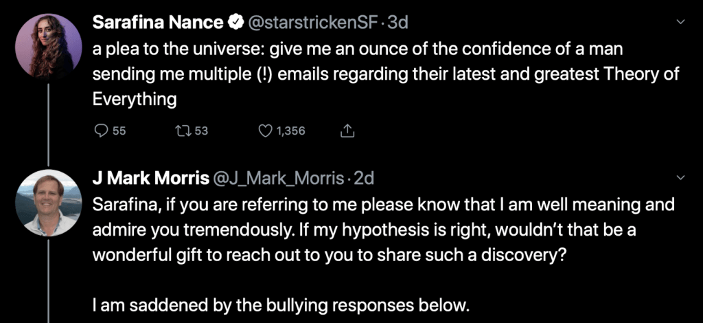 Sabine’s not interested, and that’s fine with me. However, to then go on the attack is way over the line in my opinion. If you’ve been following my blog you know how much it bothers me to constantly get attacked for sharing my NPQG ideas in social media. And it also disturbs me greatly to see others subjected to the same invective, even if their ideas are nonsense. Perhaps most of all, it frustrates me to no end that professionals in the fields of physics and cosmology would engage in such hostile and bullying behaviour toward independent ideators who hold them in high esteem and are crushed by their response. There is no excuse. There are neutral and diplomatic ways to ignore, mute, or decline unsolicited ideas and conversations. On top of all that, I think this aggro behaviour is endemic internal to the fields of physics and cosmology and is related to the challenges that so many new and diverse entrants to the fields face in their careers.