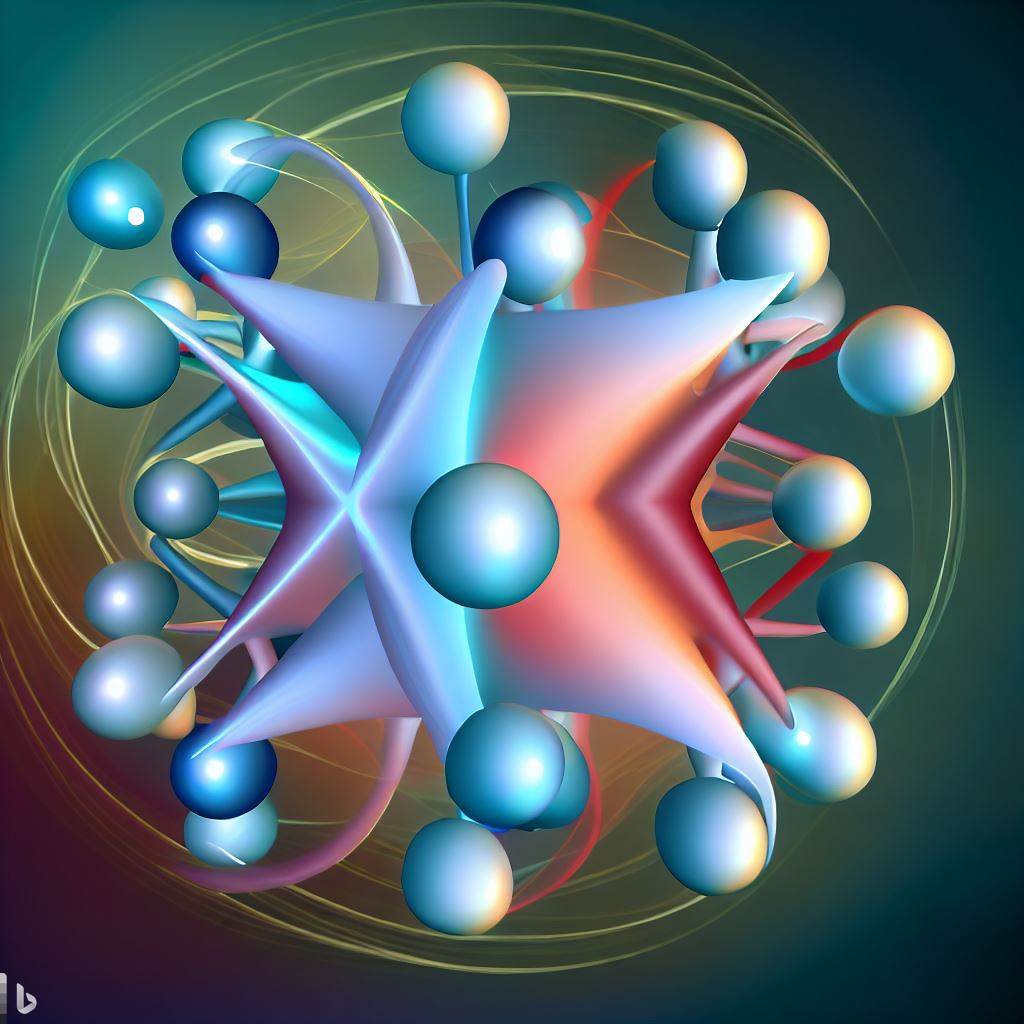 In a hypothetical idealized geometrical model create an image of how nine negative |e/6| magnitude point charges and three positive |e/6| magnitude point charges at vastly different kinetic and potential energies, could form a stable dynamical geometry assembly. Show the negative point charge as a shiny bright blue spheres and the positive point charge as a shiny bright red spheres.