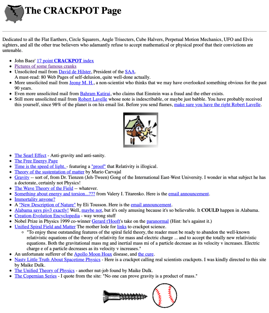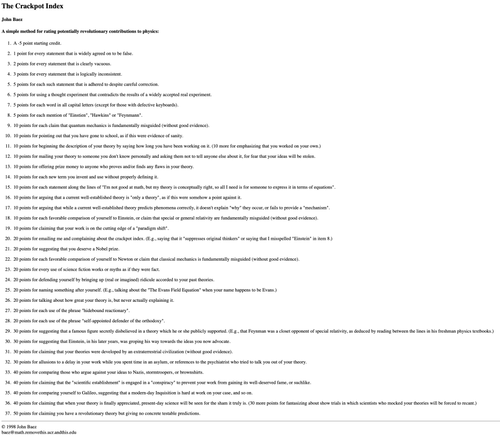 John Baez’s crackpot index even has an entry in Wikipedia. I made a comment on the talk page.