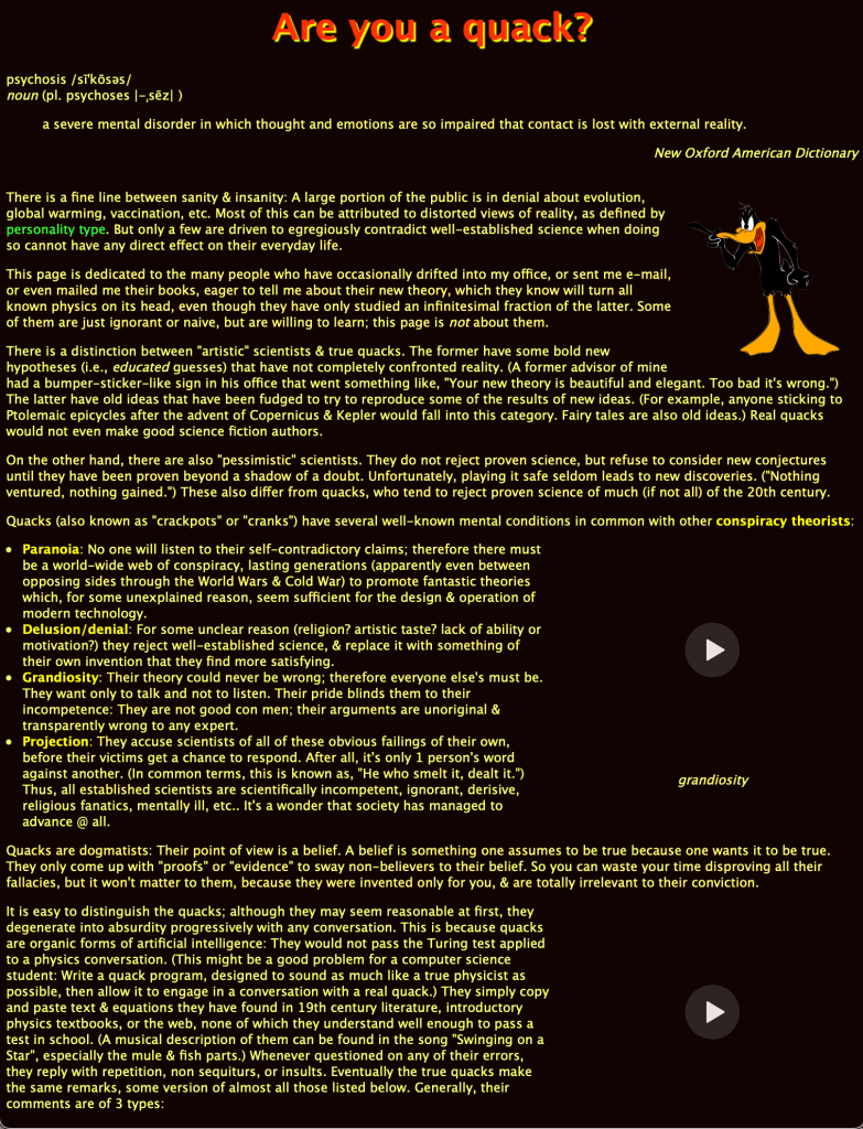 N.B. Items 2, 6, 17, 19, ~30, and 37 are actually TRUE of NPQG for entirely legitimate and scientific reasons. Baez’s index is scientifically flawed, because if someone were to develop the breakthrough theory, many of these items would be TRUE. Ooops, I put TRUE in ALL CAPS, guess that increases my score too. Give me a break. This hateful bullying index has been deployed countless times by physicists to shame and bully eager, excited, vulnerable, independent ideators who have no ill will and are only trying to help discover a solution because particle physicists and astrophysicists and cosmologists have screwed up for 150 years and can’t figure nature out despite it being right in front of their face no matter what direction they look.