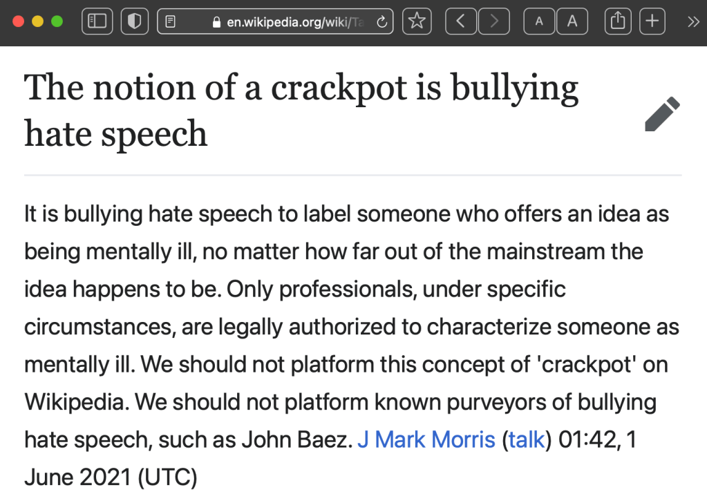 These are fairly well known physicists and their universities and institutions allow them free rein to publish hate speech and bully independent ideators. But this is only the tip of the iceberg. Google ‘crackpot’ and you find more people in the field who have written about their disdain and frustration towards ‘crackpots.’