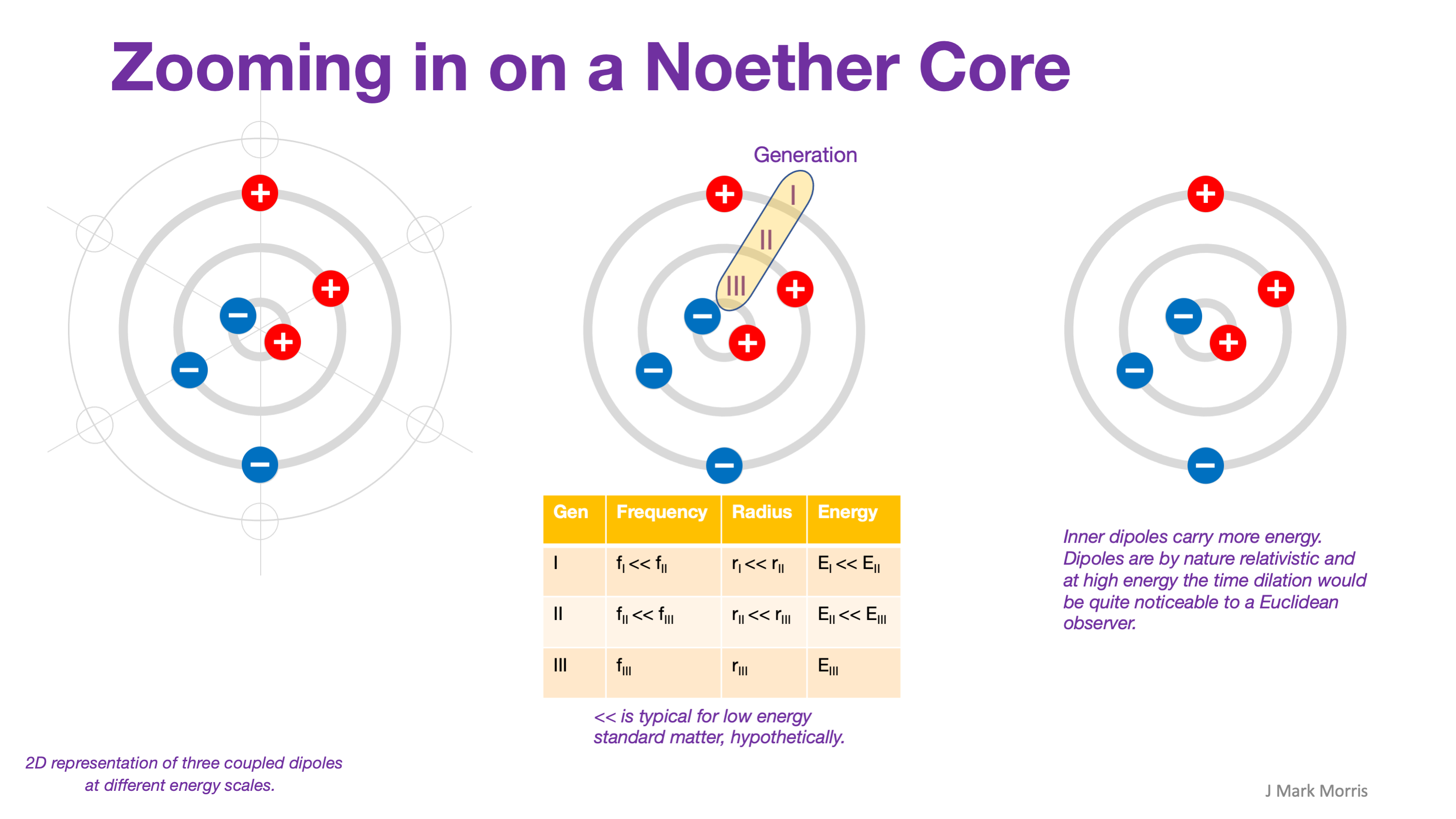 The Noether energy core is comprised of three electrino-positrino binaries, which are generally at vastly different scales of energy, and hence radius. The higher the energy the smaller the radius. Each binary is orbiting in a plane with an abstractly elliptical orbit which is often strongly circular and tracing an imaginary sphere (dynamical locally oblate spheroid?) due to precession caused by weaker external fields.