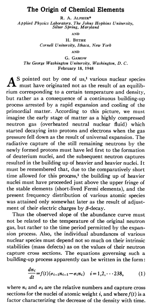 Formally titled “The Origin of Chemical Elements”, it was published in the April 1948 issue of Physical Review.