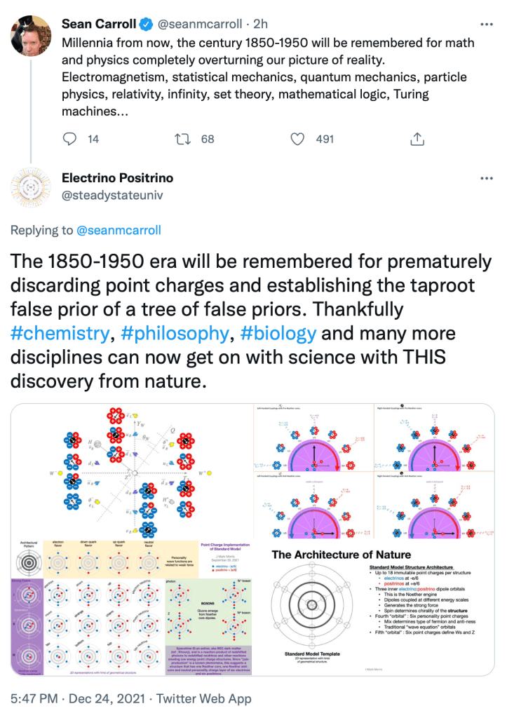 I’ve been attempting to post more abstract material where I try to get to the essence of the patterns I am seeing with my “revitalized” point charge modeling, because I think these patterns are new and unique and can be mapped to the standard physics of GR/QM/QFT/QCD/QED, and a lot of other leading edge ideas in physics (such as Khoury’s on dark matter). I have been trying to draw the patterns in somewhat geometrical pictures. I know you would prefer math, but with where I’m going I can’t even start that math without understanding how it all works geometrically. Now, if any of you would be interested, I presume this would be entirely easy for you and that’s cool, it’s all open information on my end. It would be nice if you listed me as a hobbyist co-author, but even an acknowledgement would be fine. I mean, this is your field, not mine. I’m just a creative person, trained by all your fields work and outreach, trying to think of some new fresh ideas by going back to old ones and repairing them.
