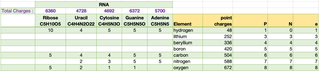Here are my unchecked calculations of the point charges comprising key constituents of RNA. I don’t know the veracity of this post, but the author claims around 200 billion atoms to encode the genome. Assuming the average is approximately 350 point charges per atom in each DNA component then that is rougly 70 trillion point charges in the genome. Fascinating.