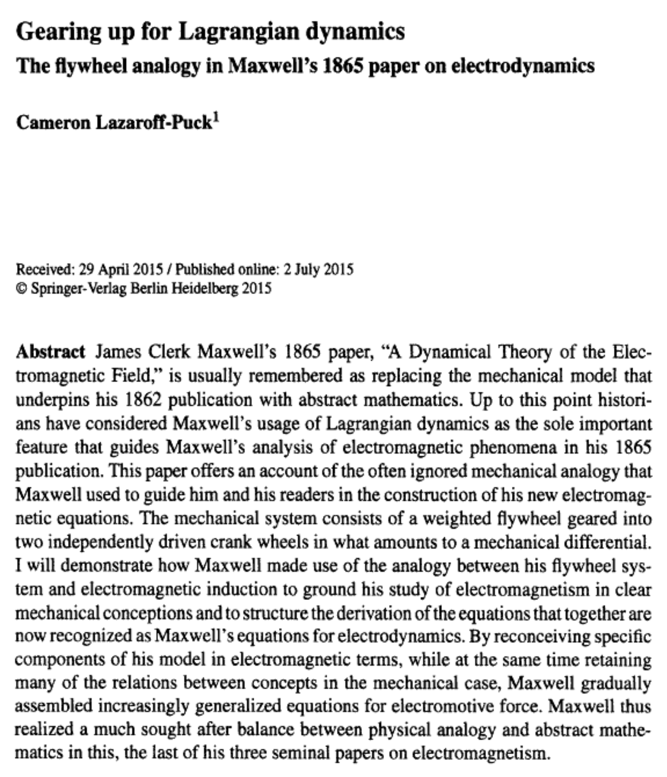 In his 1861 model, Maxwell showed that, when suitably adjusted, the workings of his complex machinery of gears and wheels matched those of electromagnetism. Magnetic energy was stored in the kinetic energy of the spinning gears, and the gears would spin and bulge, capturing the way changes in magnetic fields generated currents.