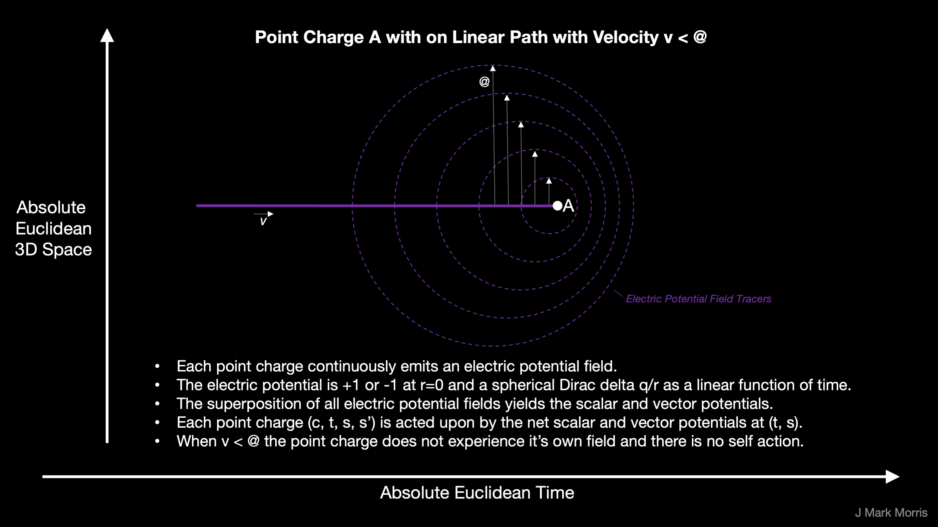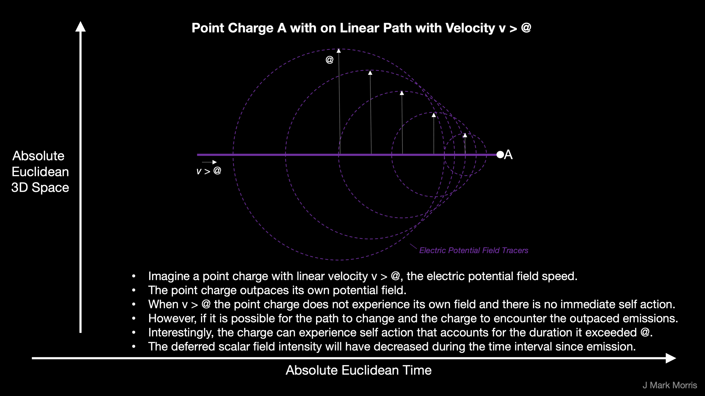 If a point potential is traveling at a velocity v < @ then it stays within the spheres of its own Dirac sphere stream and no self action occurs, or rather the action is null.