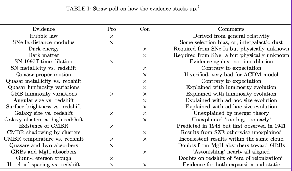 p.s. In a 2018 paper (1107.2485v2.pdf (arxiv.org)) J.G. Hartnett examines whether the universe is really expanding. That caught my eye and the table below shows the evidence pro and con that was examined. It would be really great if scientists would perform such an analysis on NPQG cosmology. My expectation is that not only would it reconcile all the confusion, but that it can explain why the confusion happened. I expect that the JWST telescope observations will shed a lot of light on this.