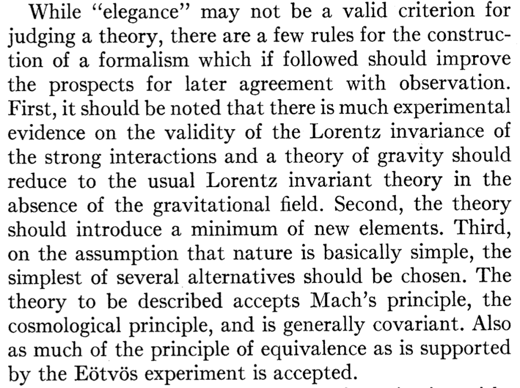 In Robert Dicke’s 1957 paper, “Gravitation without a Principle of Equivalence” he writes of the requirements for a new theory of gravitation.