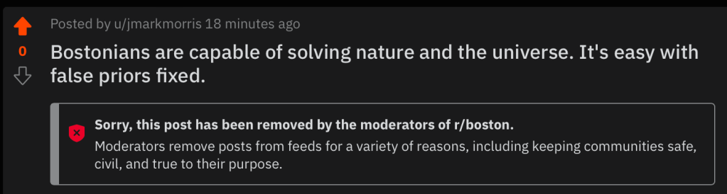 I posted the following in reddit r/boston on November 5, 2022 and it was removed in less than 15 minutes. How about that for idea suppression?