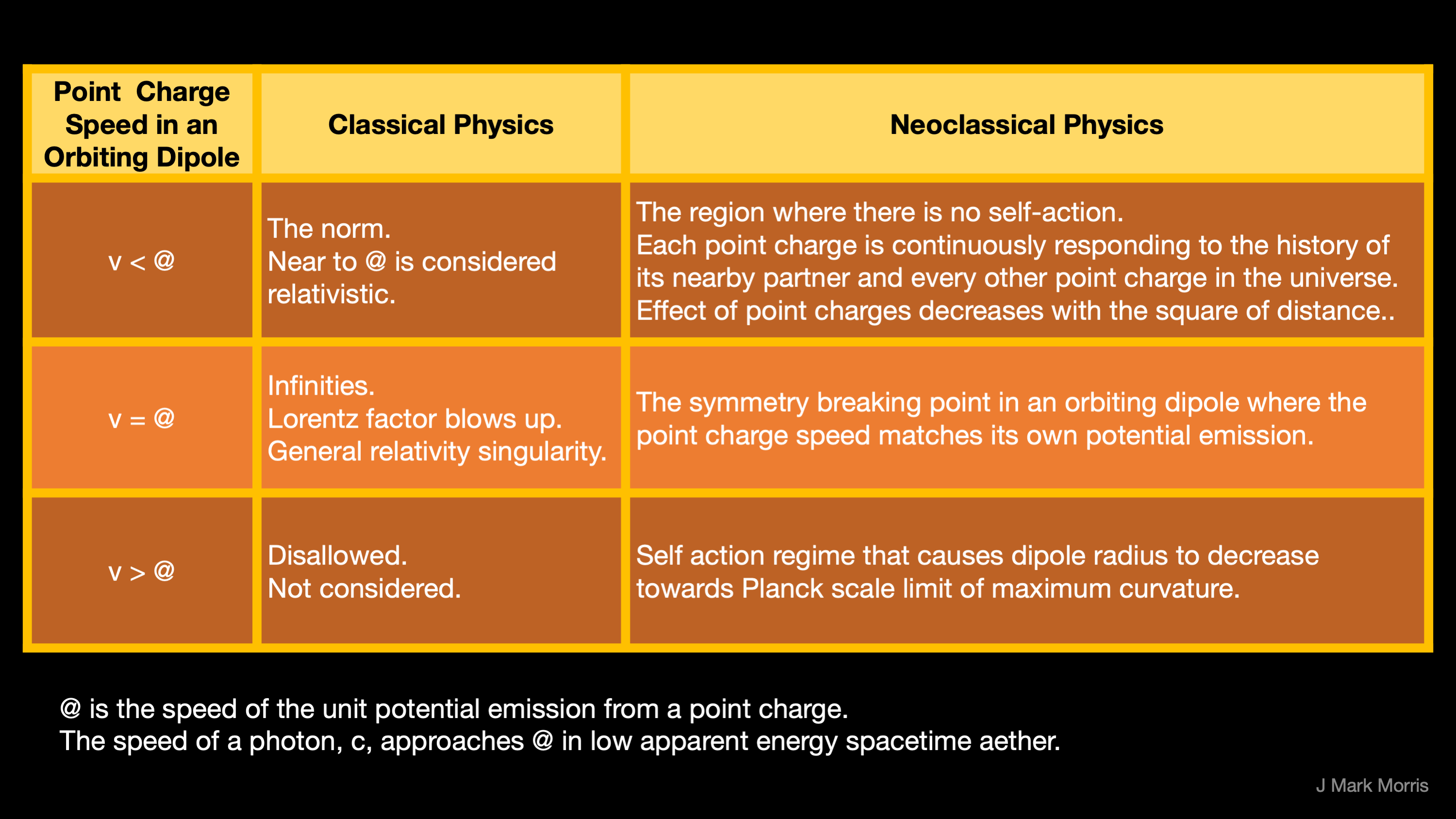 At this point we should note that the scientists of the classical to quantum transition era chose the speed of the photon, c, as the speed of the potential field and the maximum speed of a point charge. This is an ontological inversion! Now that we are imagining photons as assemblies of point potentials, on what rational basis would the speed of a photon assembly determine any characteristics of a point potential? It wouldn’t! Rather the characteristics of the point potential would determine the behaviour of all assemblies of point potentials, including the photon. Therefore, we need to reconsider these assumptions.