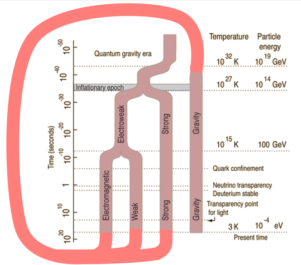The standard chart of the four forces is quite interesting. Why is the smallest force by many orders of magnitude, gravity, originating at the highest energy? Seems odd doesn’t it? Actually it is a clue to physicists, but since they are on a false prior worldline they can’t see how the solution works.
