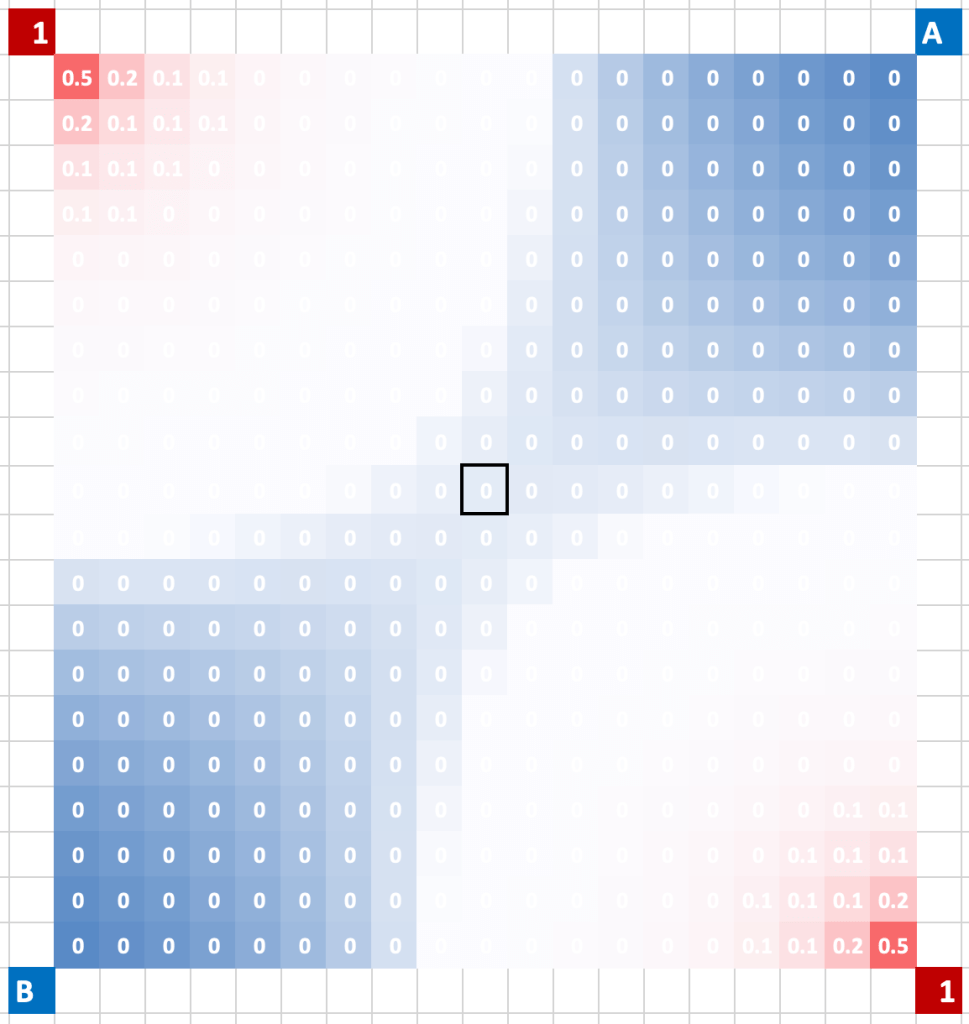 I just had an insight into the figment of an idea I had several years ago. I was thinking about how the spacetime assemblies between two isolated and separated point charges would be more excited than the spacetime assemblies in any other direction. The diagram shown was made in Microsoft Excel. It shows two stationary positive point charges labeled “1” in an otherwise neutral field. I approximated the potential in each 1×1 cell using a formula based on the distance and the 1/r potential field. Using conditional shading based on the calculated values, you can visualize the saddle shape.